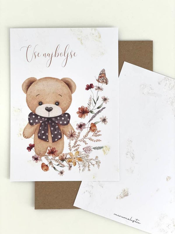 Čudovita voščilnica za praznovanje rojstnega dne. Voščilnica je natisnjena na 350g/m2 naravni karton in pride skupaj z reciklirano kuverto.
